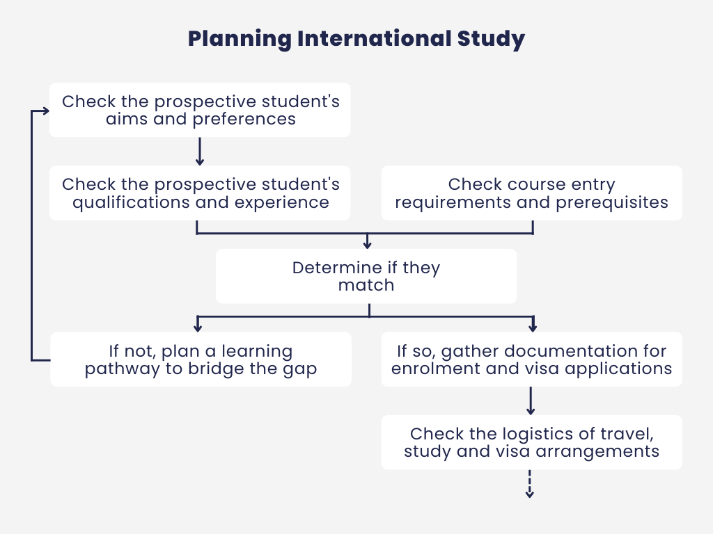 When planning international study with prospective students, the student counsellor should take into account their preferences and objectives, as well as the availability of courses , their entry requirements, costs, duration, content, and outcomes. He/she should make sure courses are suitable for the prospective student in terms of both entry requirements and exit outcomes. In addition, he/she must take into account the logistics of travel, study, and living arrangements.